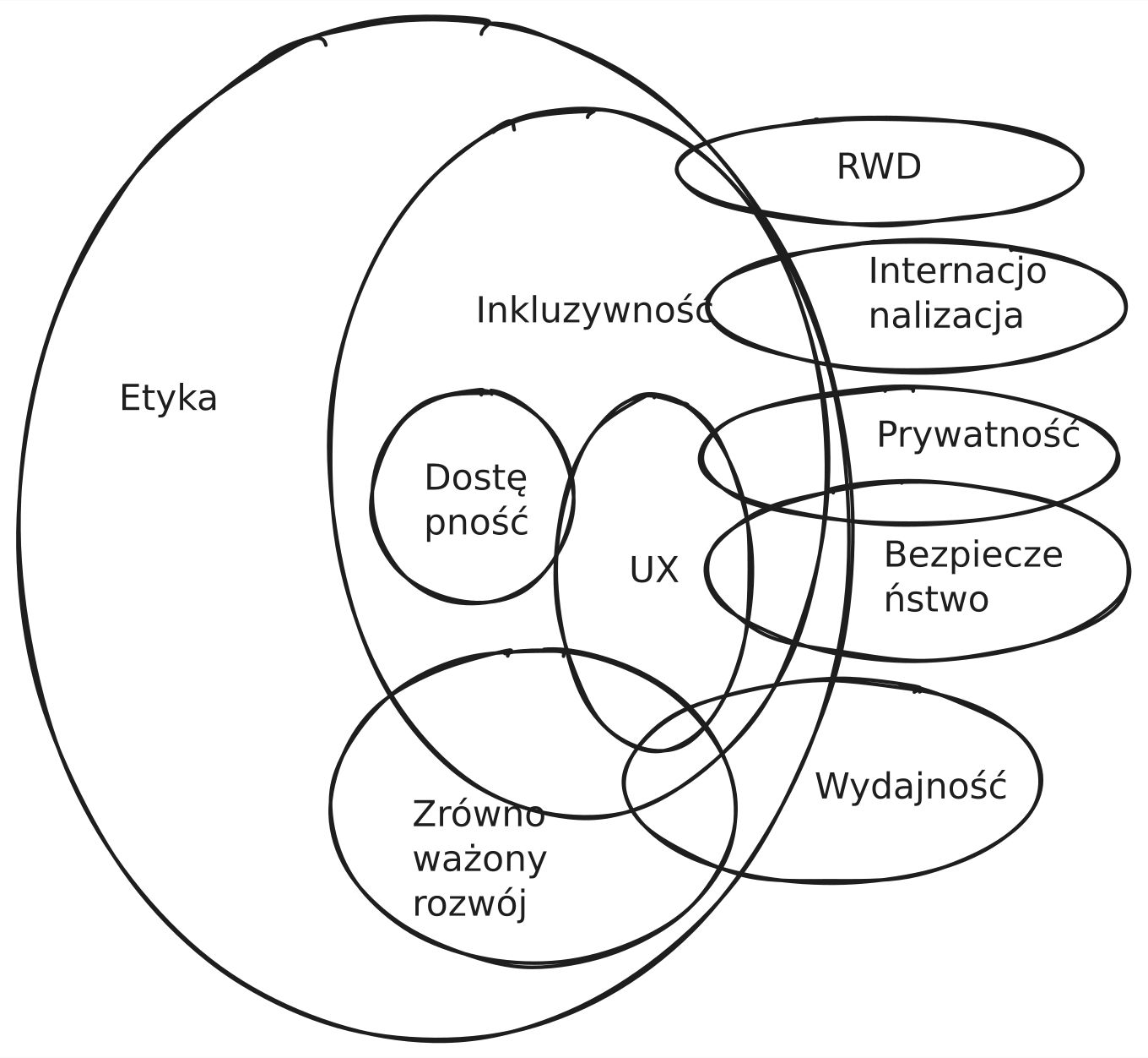 Etyka jest najbardziej podstawową kategorią. To ona tak naprawdę stanowi ramy dla wszystkich innych działań wokół strony. W końcu “strona mająca działać dobrze dla każdego” jest założeniem etycznym. Wewnątrz etyki mamy następnie inkluzywność – a więc wyjaśnienie, co znaczy to założenie. Z inkluzywności wywodzą się dwie kolejne rzeczy – dostępność oraz UX. Obydwie odpowiadają na pytanie, jak zrobić stronę, która działa dobrze dla wszystkich. I choć skupiają się na nieco innych aspektach tego pytania, to mocno się ze sobą zazębiają. Dużym problemem etycznym jest też [[sustainability zrównoważony rozwój]], który zazębia się z inkluzywnością i UX-em. Bo każe nam przewartościować nasze pierwotne założenie i dodać do niego jeden istotny element – upewnienie się, że nasza strona nie zaszkodzi planecie.